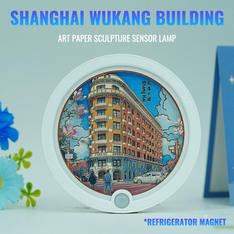 The Wukang Building Refrigerator Magnets features exquisite 3D paper sculpture of Shanghai's iconic architecture. With magnetic back and elegant illumination, it serves as both a decorative fridge magnet and ambient night light, perfect for home or office decor.