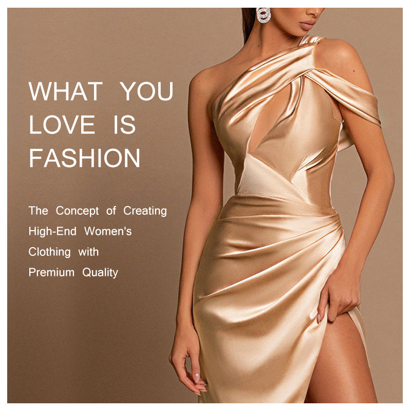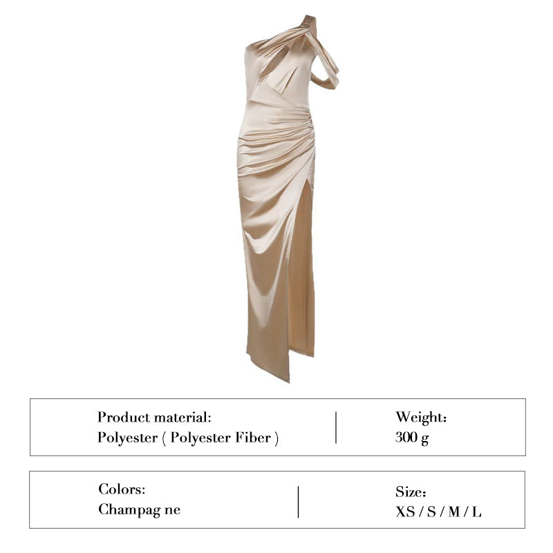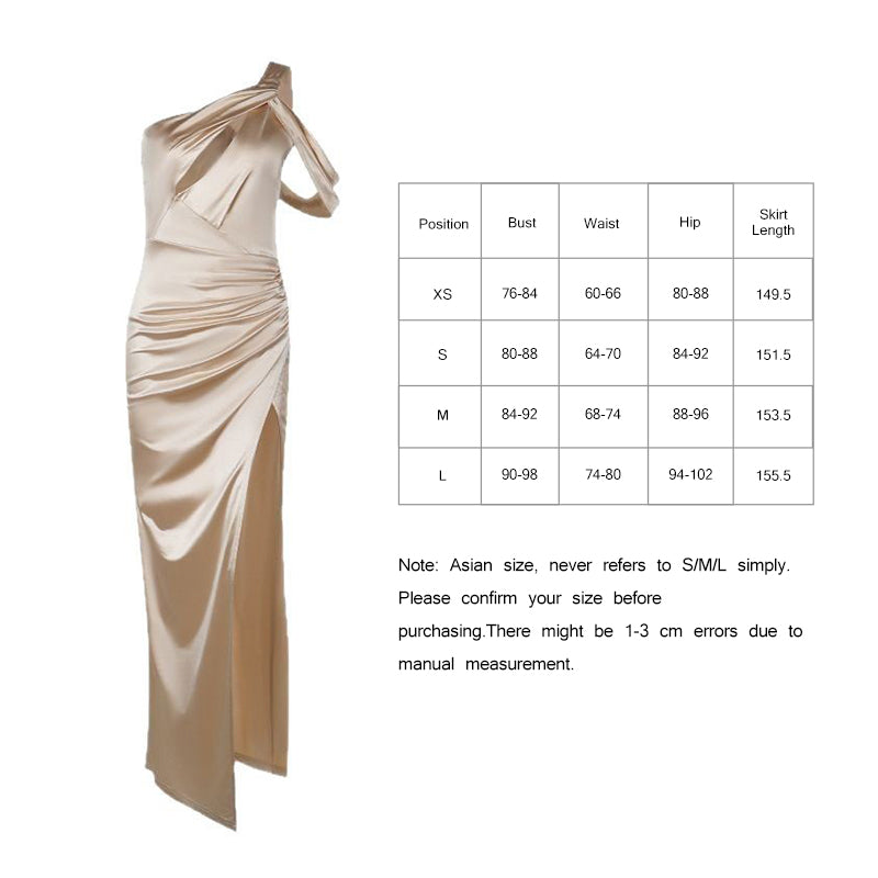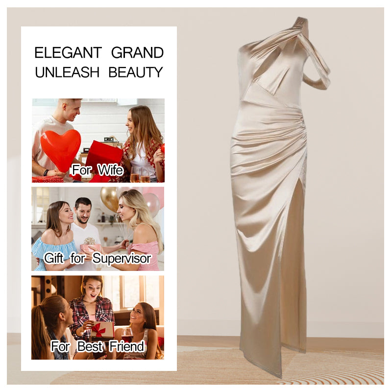 Champagne-colored evening gown featuring asymmetric slit and cut-out design. This bodycon dress combines elegant silhouette with contemporary details for formal occasions.