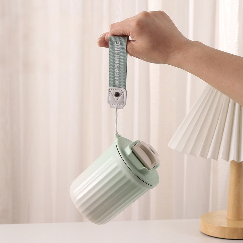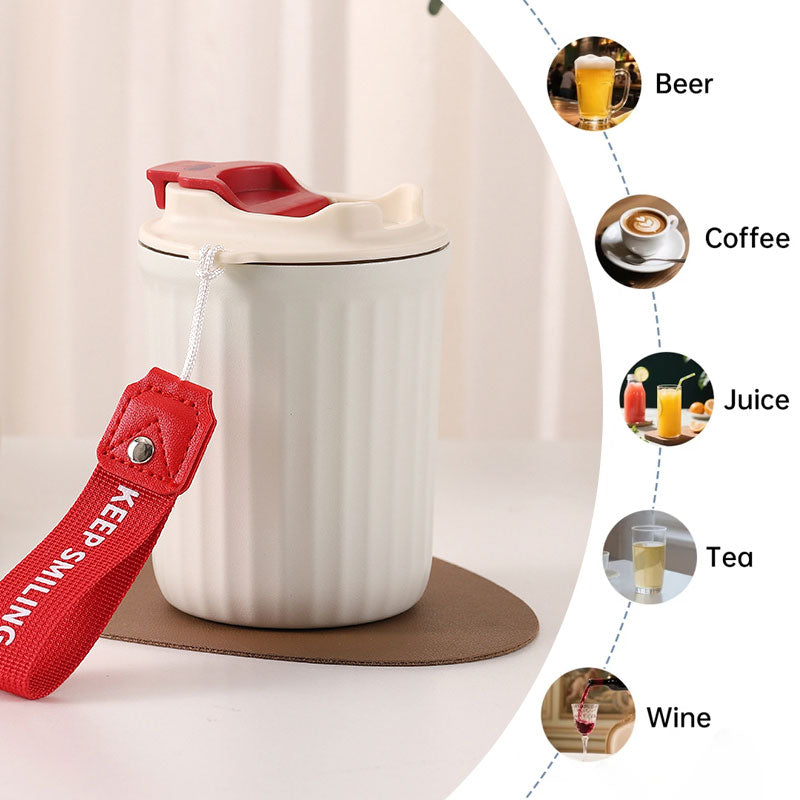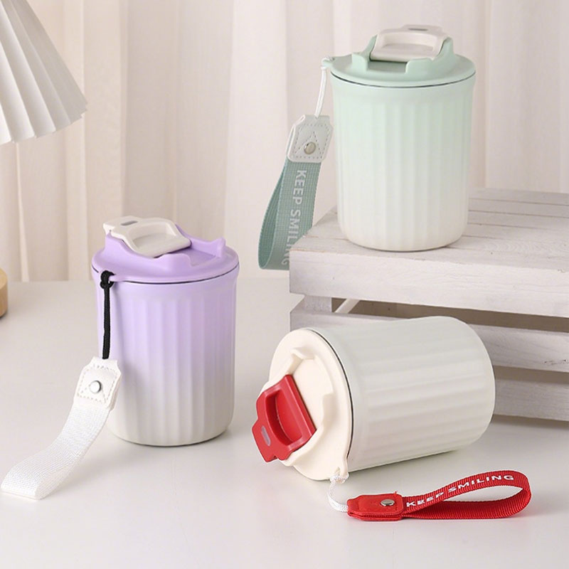 Enjoy your beverages at the perfect temperature with our 380ml Coffee Cup. Featuring a convenient flip-open lid and comfortable carry rope, this insulated tumbler is designed for modern, on-the-go lifestyles. The stylish vertical line design and multiple color options make it your perfect companion for home, office, or outdoor adventures.