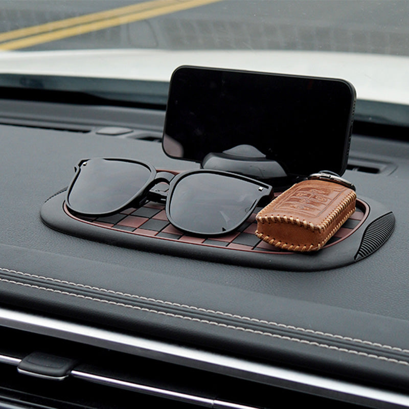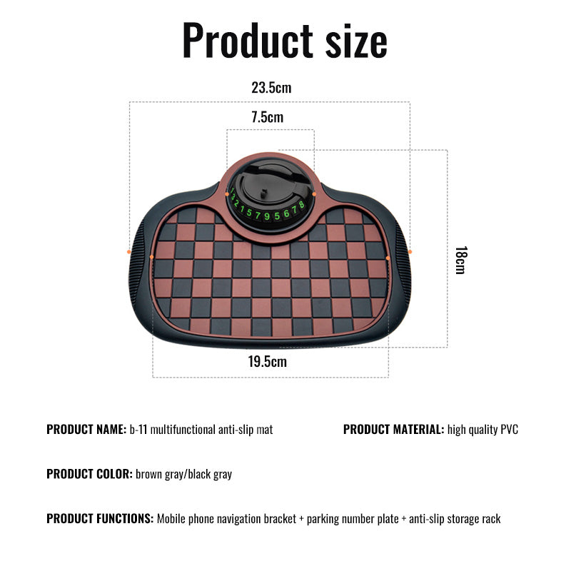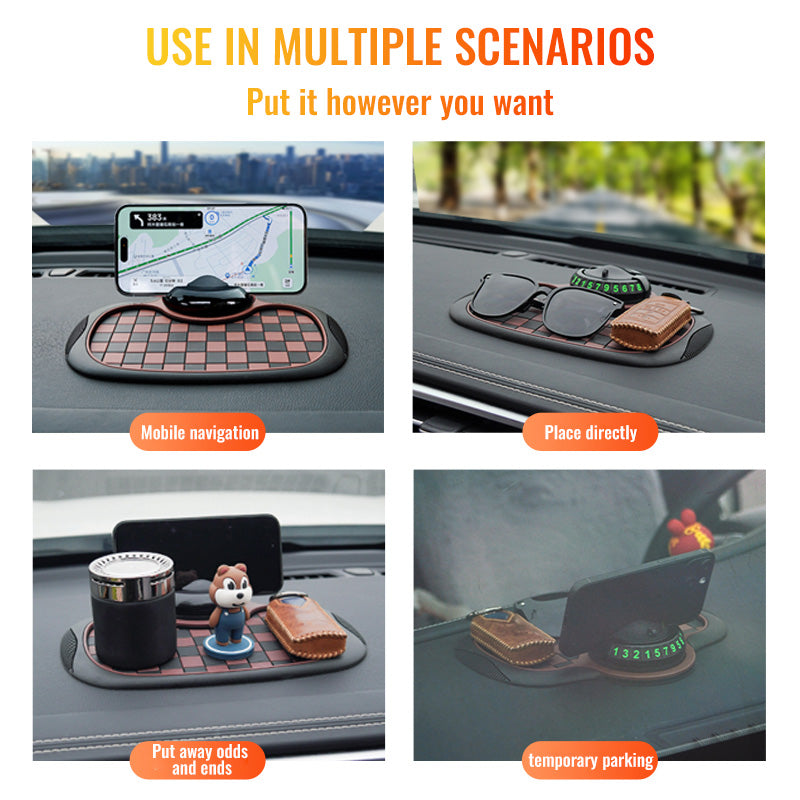 Upgrade your driving experience with the Multi-Function Car Anti-Slip Mat. Made of high-quality PVC, this versatile mat combines a 360° rotating phone holder, hidden parking number plate, and anti-slip storage tray – keeping your essentials secure and organized while you drive.