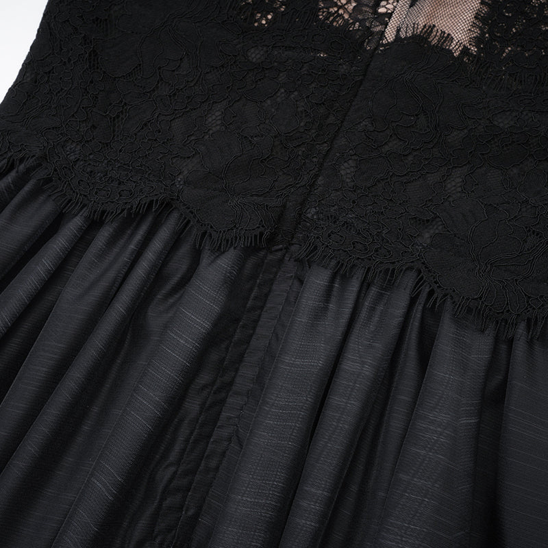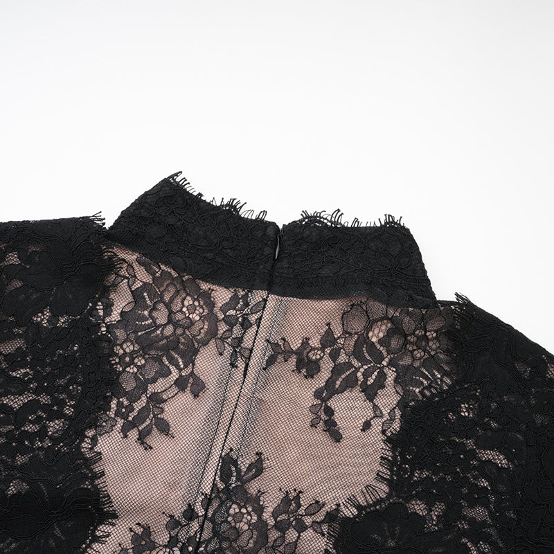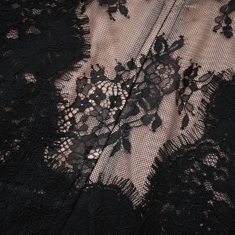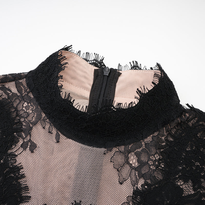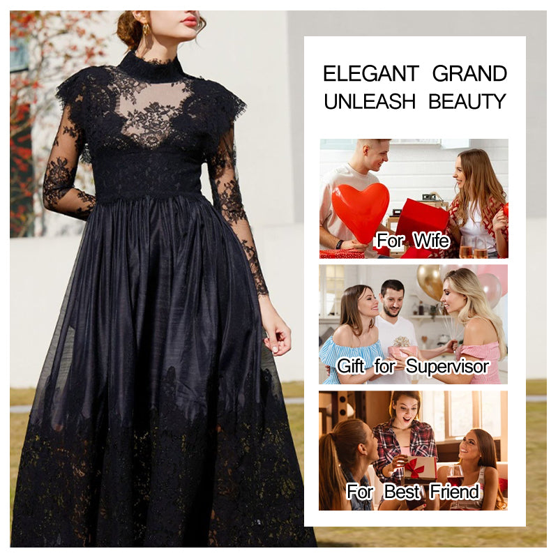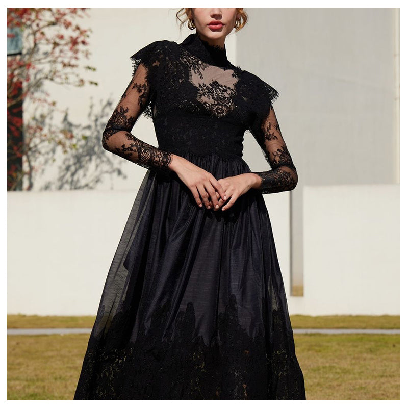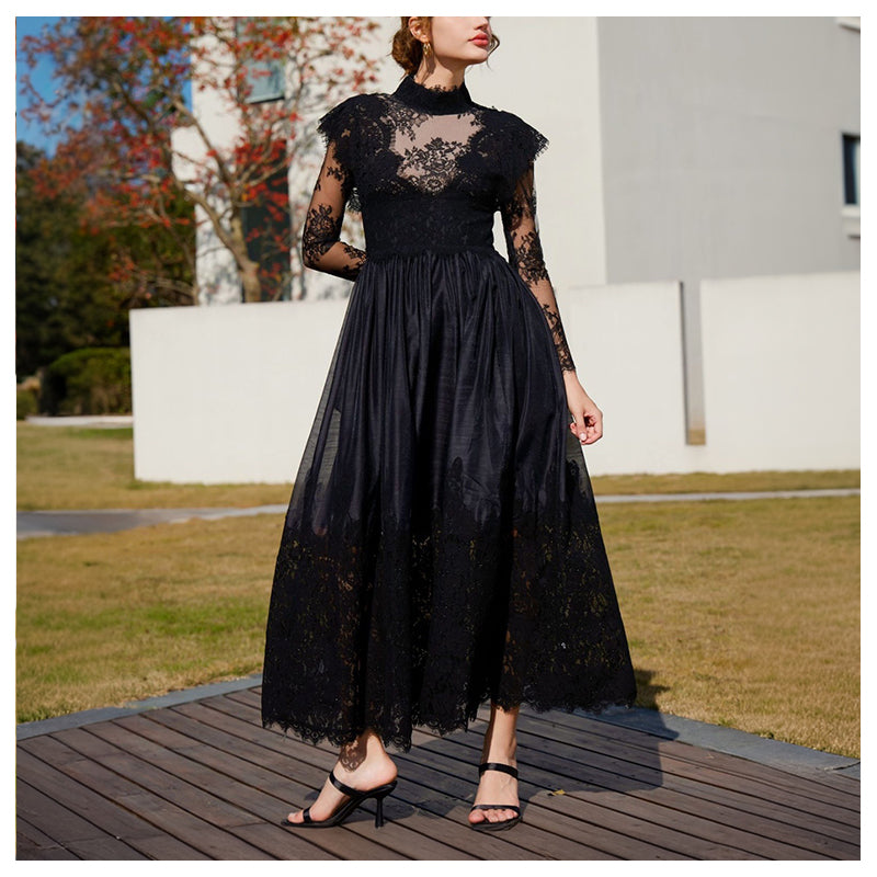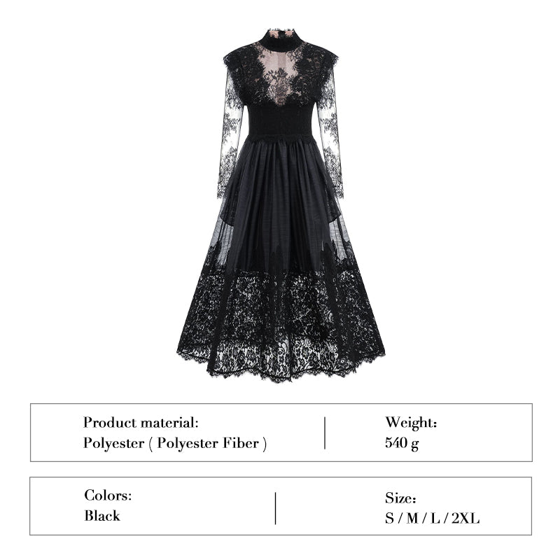 Long sleeve dress featuring delicate lace panel design. Crafted from polyester fabric for versatile wear from daytime elegance to evening occasions.
