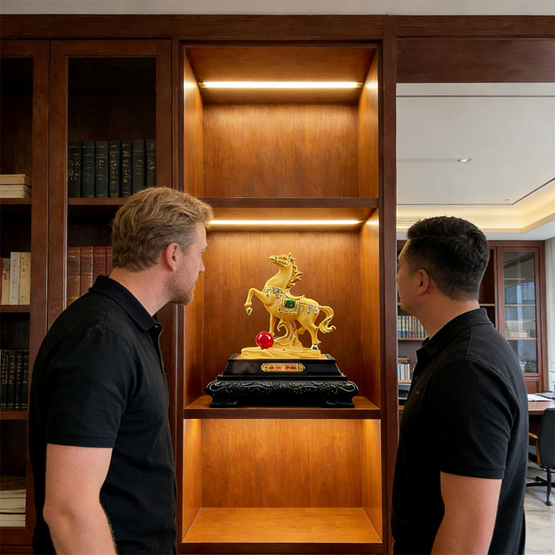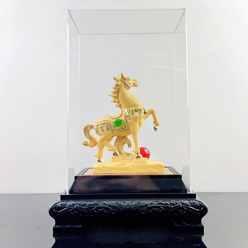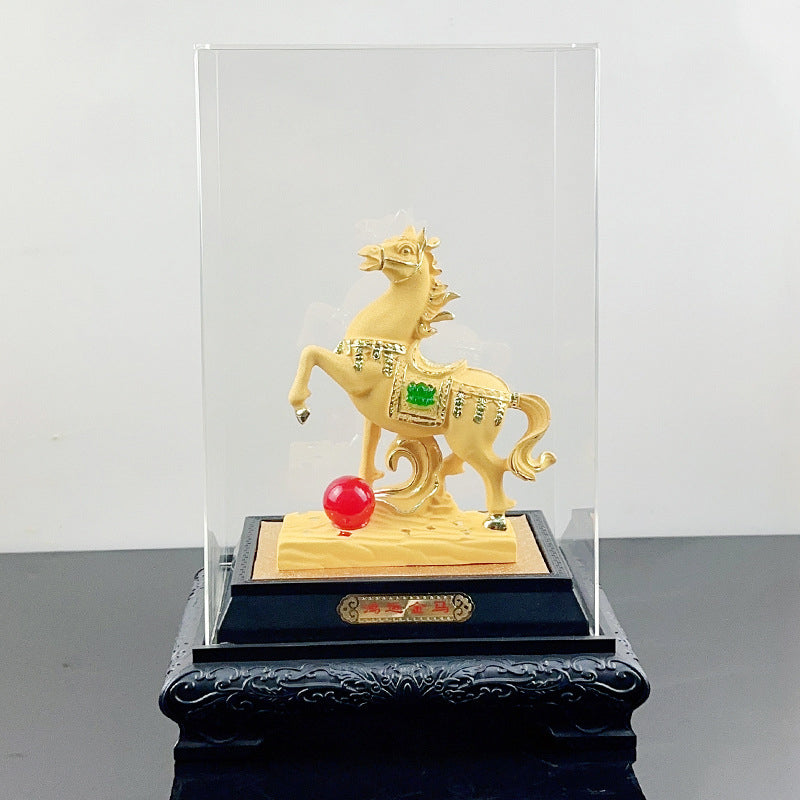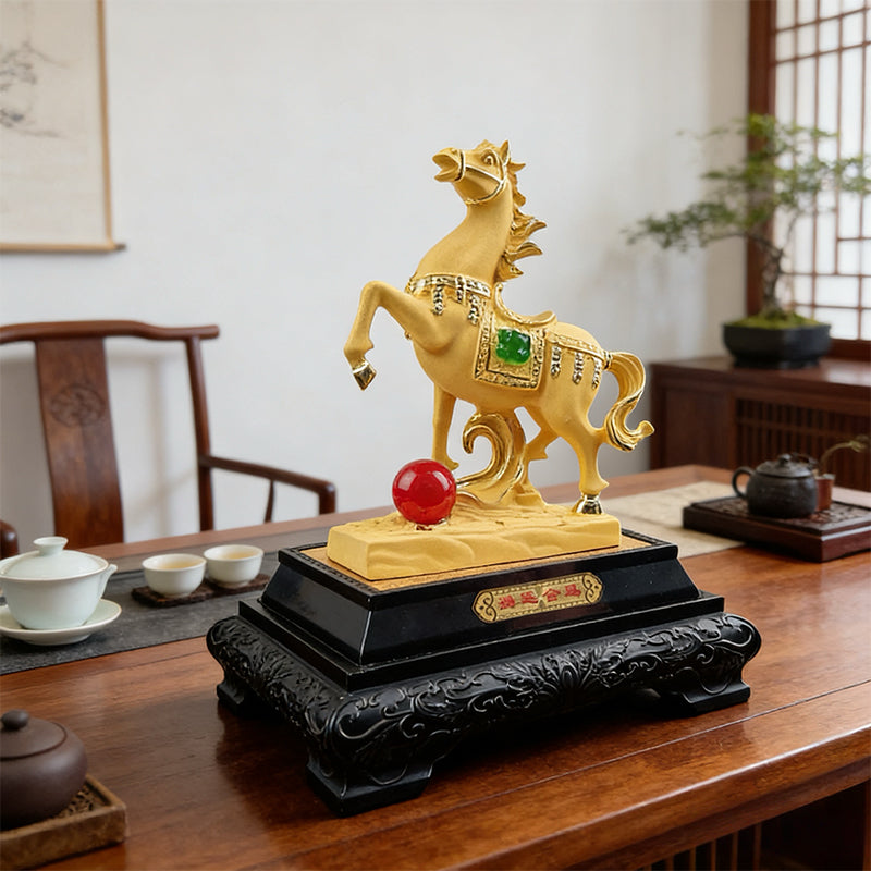 Enhance your space with this majestic Velvet Gold Horse Feng Shui Statue. Crafted from heavy-duty resin with a luxurious velvet gold finish, this impressive ornament symbolizes success, prosperity, and good fortune—ideal for home decor, office Feng Shui, or as a meaningful business gift.
