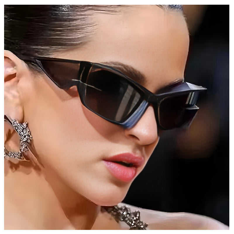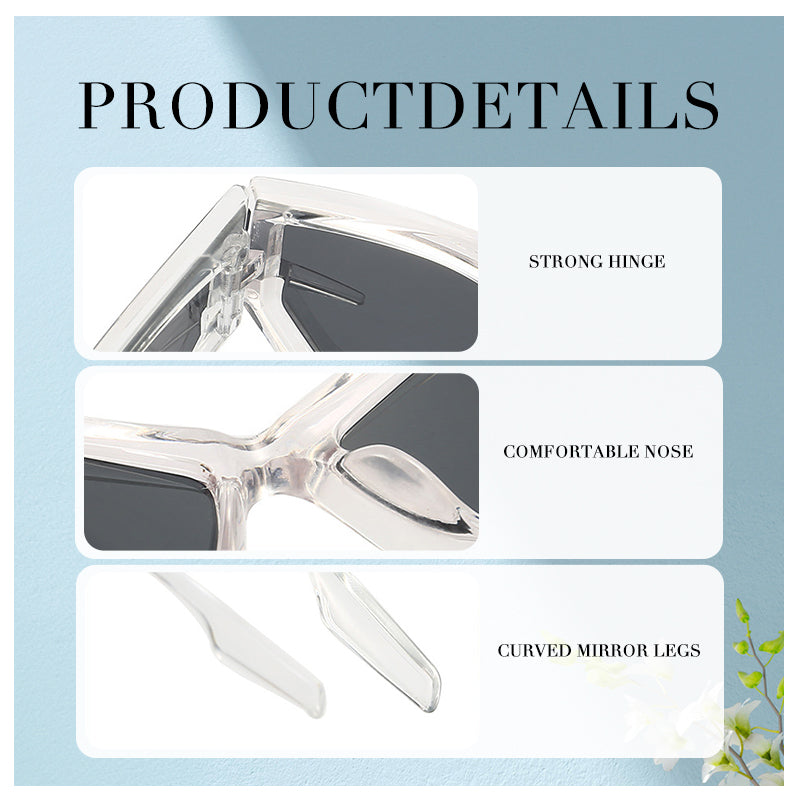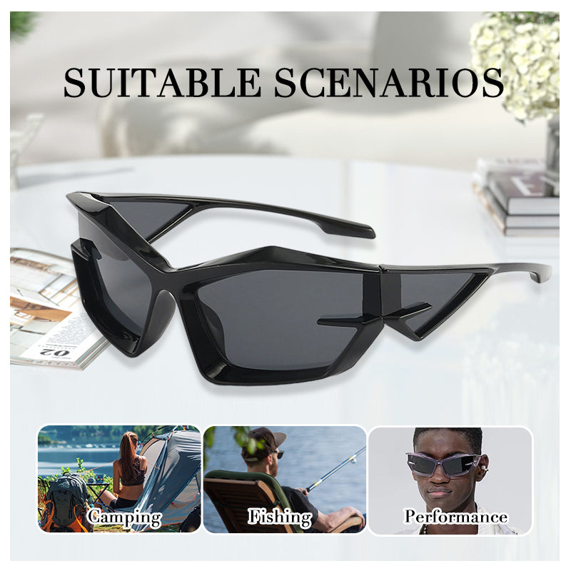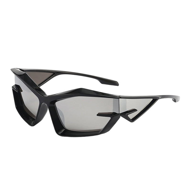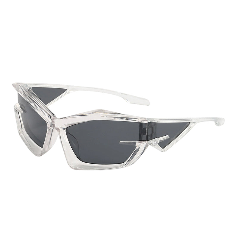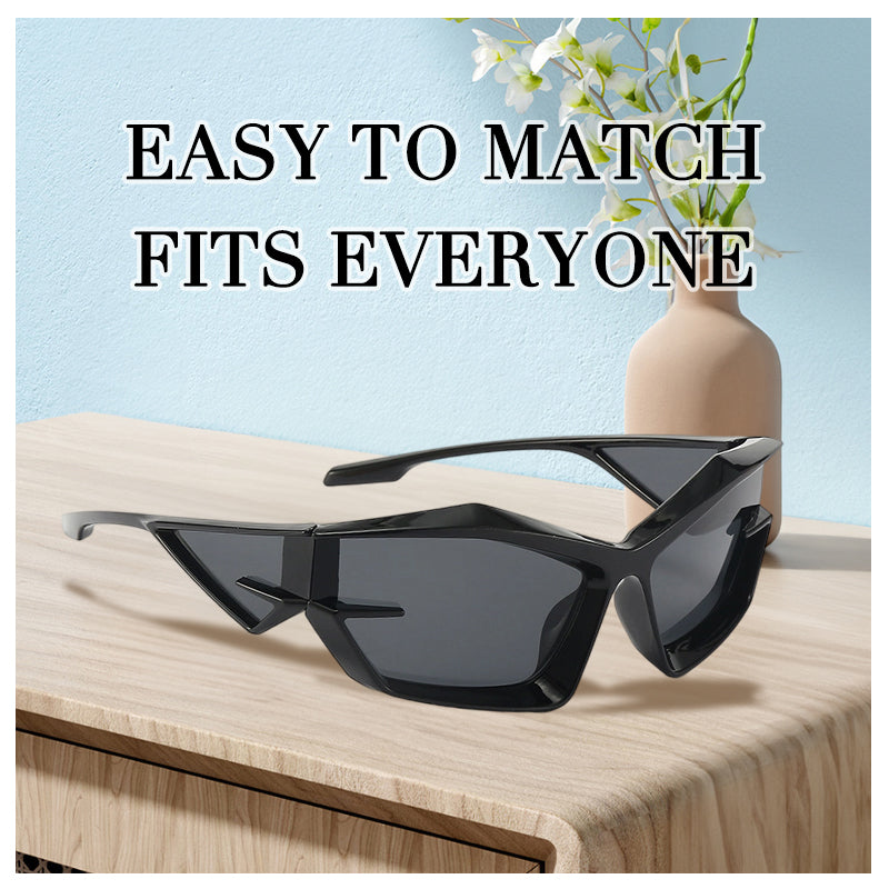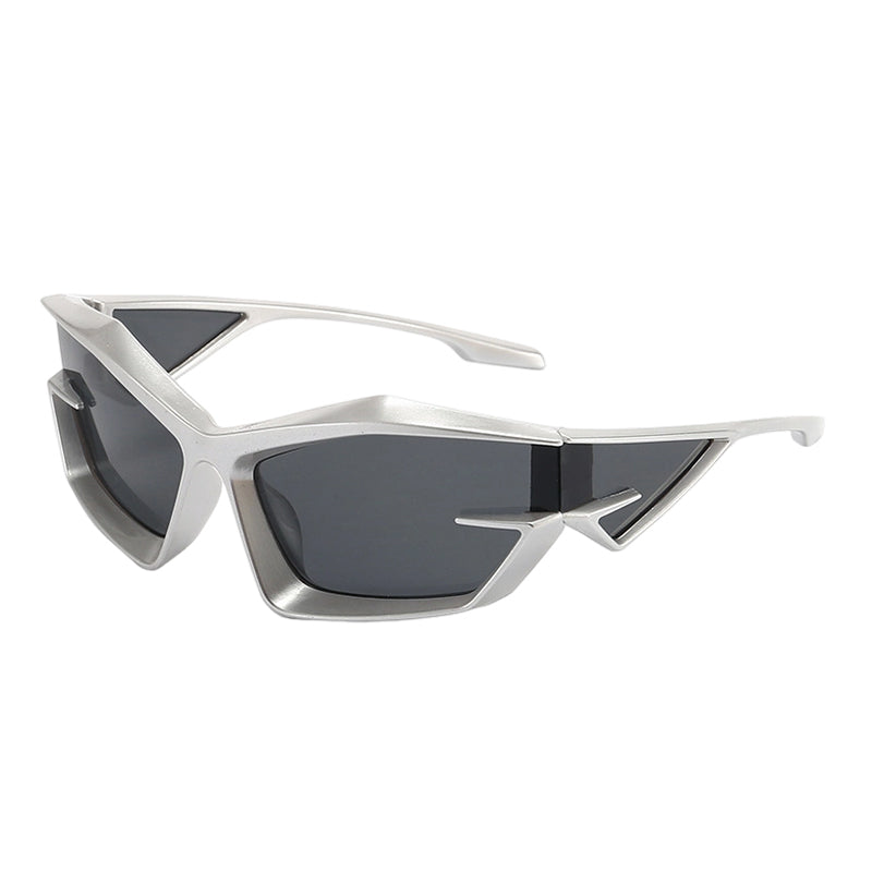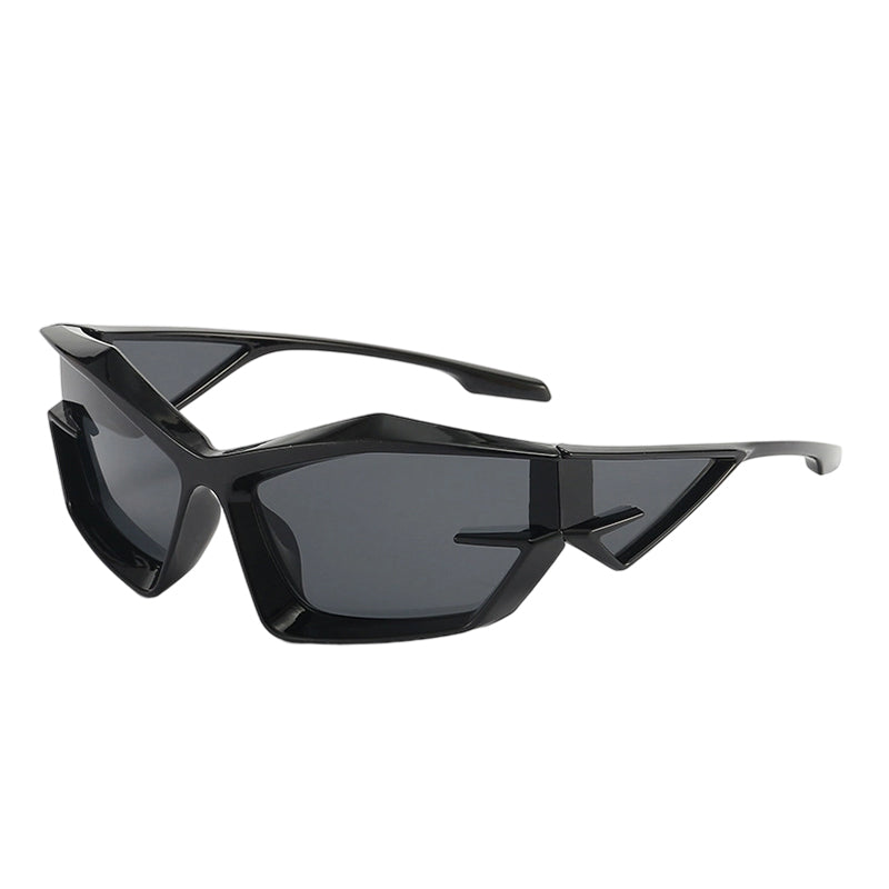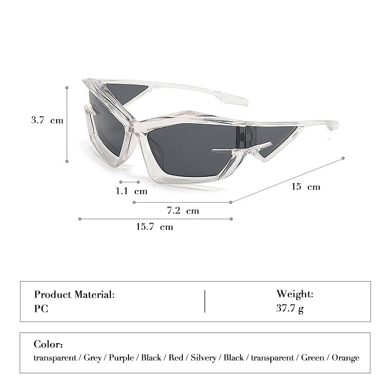 Y2K-inspired tech sunglasses featuring full PC construction and futuristic design. Designed for urban fashion and daily sun protection with multiple frame and lens combinations.