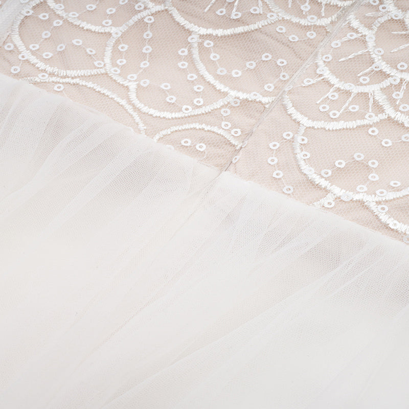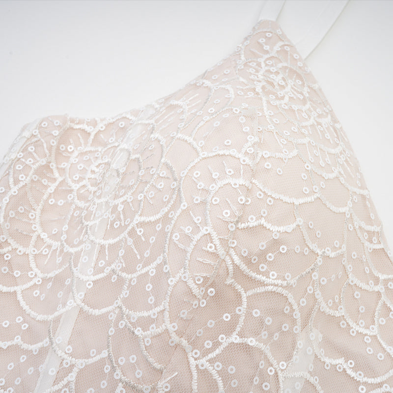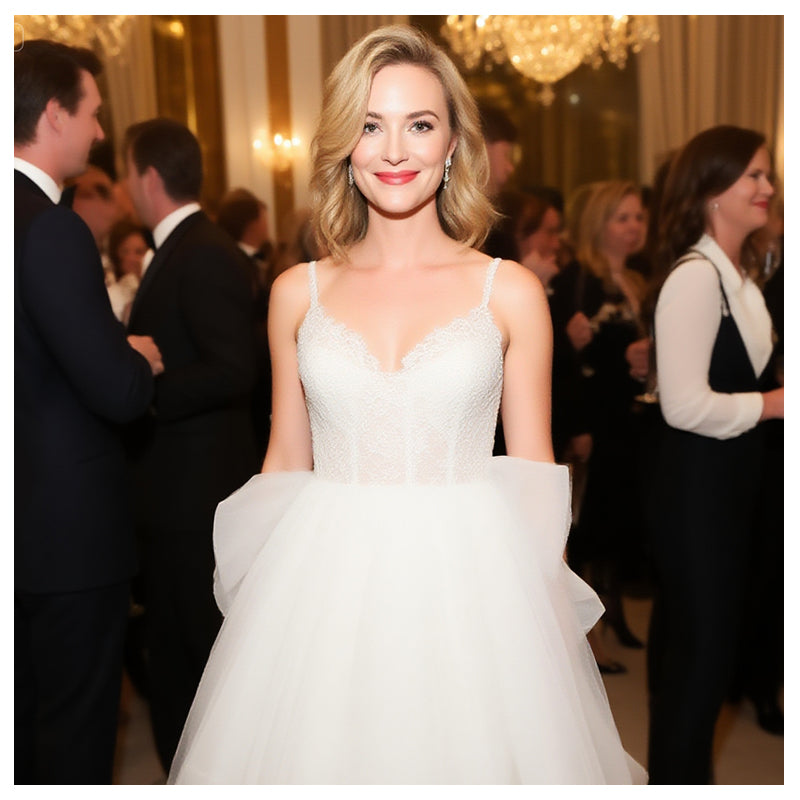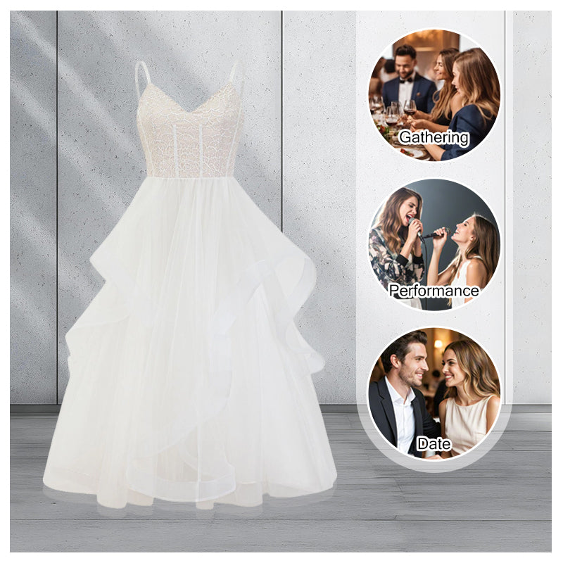 White evening gown designed for formal occasions and special events. Features a graceful silhouette suitable for banquets, weddings, and celebrations.