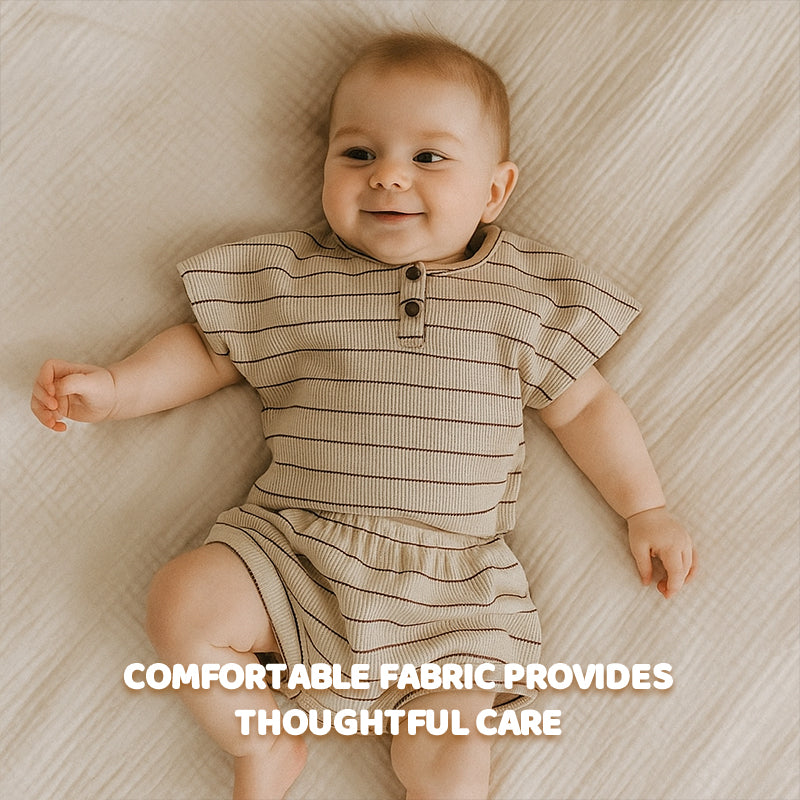 Dress your little one in style with our 2024 Baby Summer Fashion Outfits. This adorable two-piece set features a classic striped short-sleeve tee paired with comfortable shorts, perfect for warm weather adventures. Made from 100% soft cotton, this Instagram-worthy outfit keeps your baby cool and comfortable while looking absolutely charming.