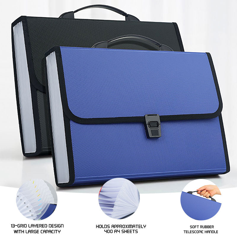 Organize your important documents with premium efficiency using our Business Accordion Bag. Featuring a smart 13-grid layered design and reinforced thickened edges, this A4 organizer offers generous capacity for approximately 400 sheets while maintaining a professional appearance. The soft rubber telescopic handle and secure closure system make it ideal for office, school, and business travel use.