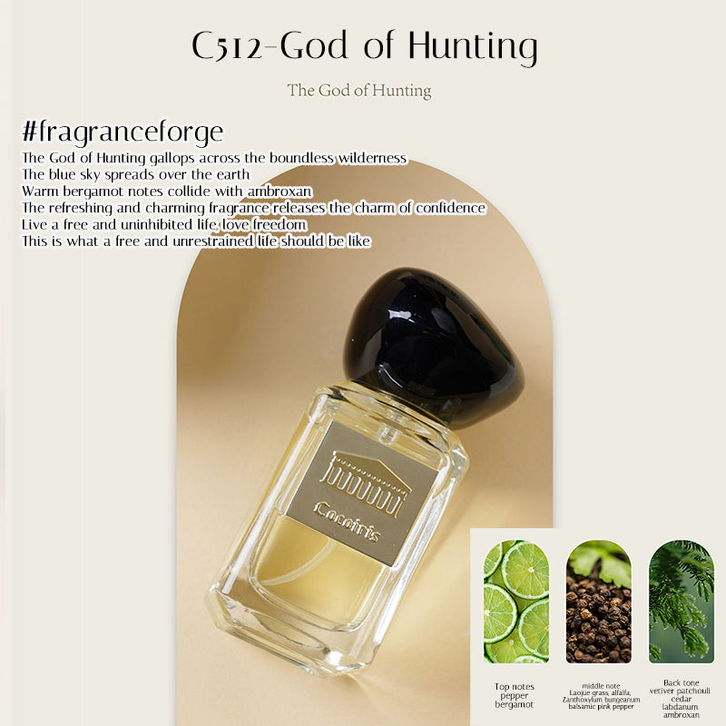 C512 – God of Hunting: A bold, fresh fougère with bergamot and ambroxan for a confident, free-spirited vibe.