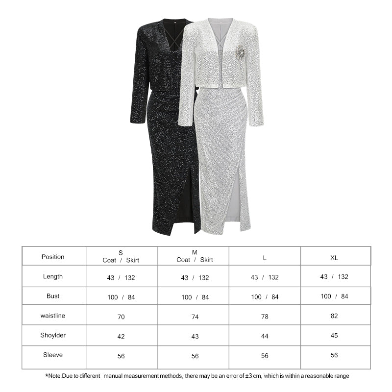 Elevate your evening wardrobe with our stunning two-piece set, featuring a tailored blazer and a dazzling sequin slip dress. Designed with an elegant aesthetic, this ensemble is perfect for birthdays, banquets, galas, or any special occasion where you want to make a lasting impression. The combination of sophisticated structure and glamorous shimmer creates a versatile look that transitions seamlessly from formal dinners to celebratory parties.