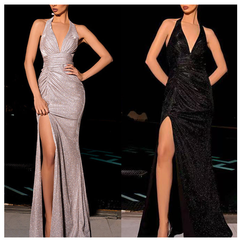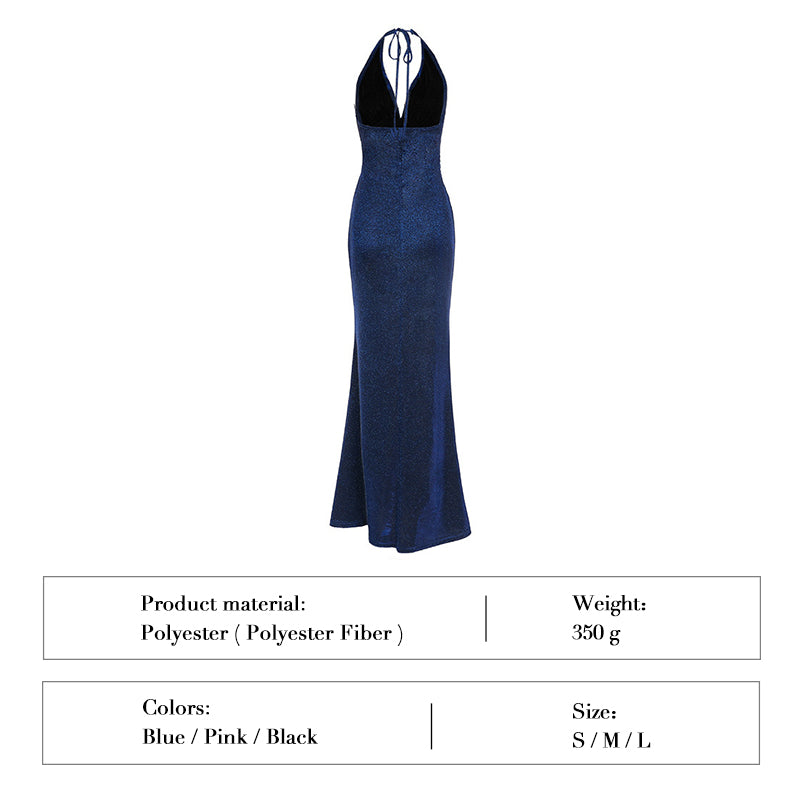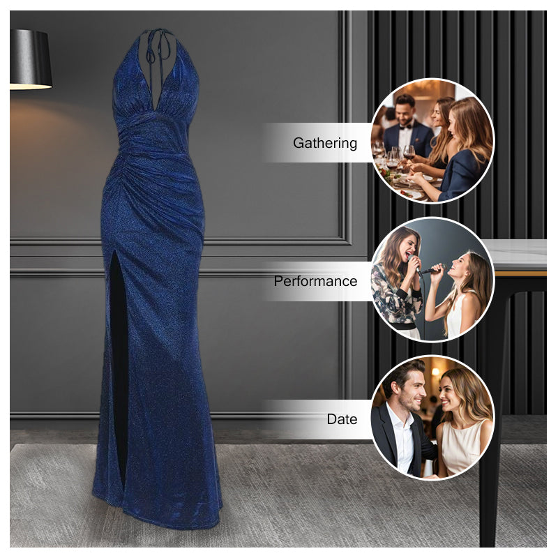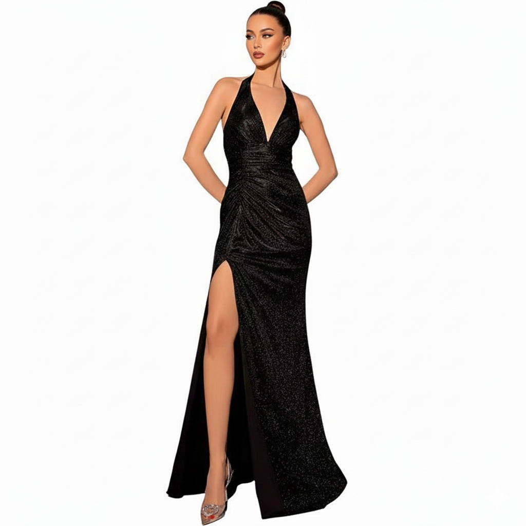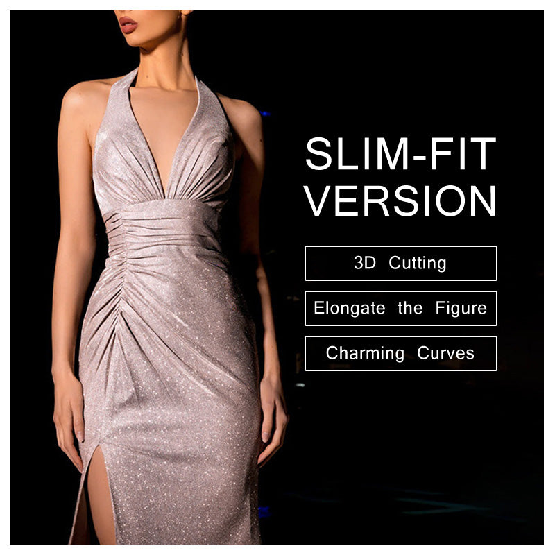 Discover the perfect blend of sophistication and allure with our new slim-fit halter neck dress. Designed with a flattering V-neck and a daring high slit, this shimmering dress features 3D cutting technology to elongate your figure and highlight your curves. Ideal for parties, dates, or special events, it combines fashion-forward design with a comfortable fit to make you feel confident and elegant.