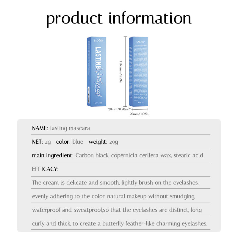 Define your lashes with SADOER Long-Lasting Mascara. This smudge-proof, waterproof formula delivers lasting curl, separation, and volume for a feathery, wide-awake look that stays fresh all day.