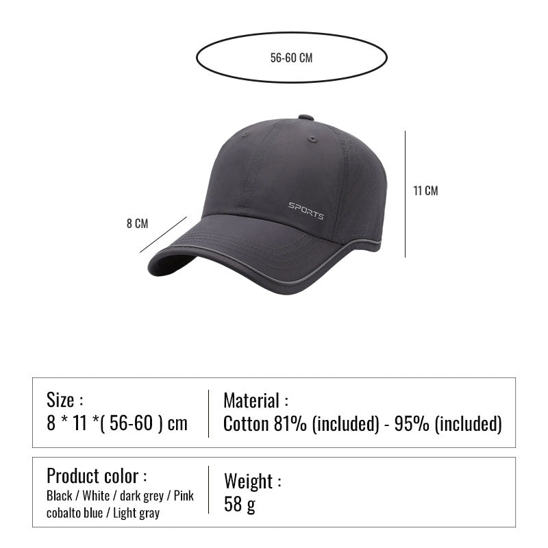 Stay cool and protected with our Quick-Dry Peaked Cap, the perfect lightweight accessory for spring and summer. Made with high cotton content for superior breathability, this versatile baseball cap offers comfortable sun protection for all your outdoor adventures. The moisture-wicking fabric and adjustable design ensure a perfect fit for both men and women.