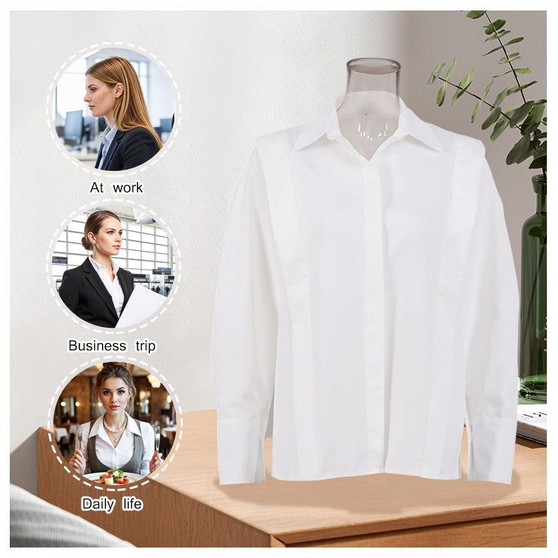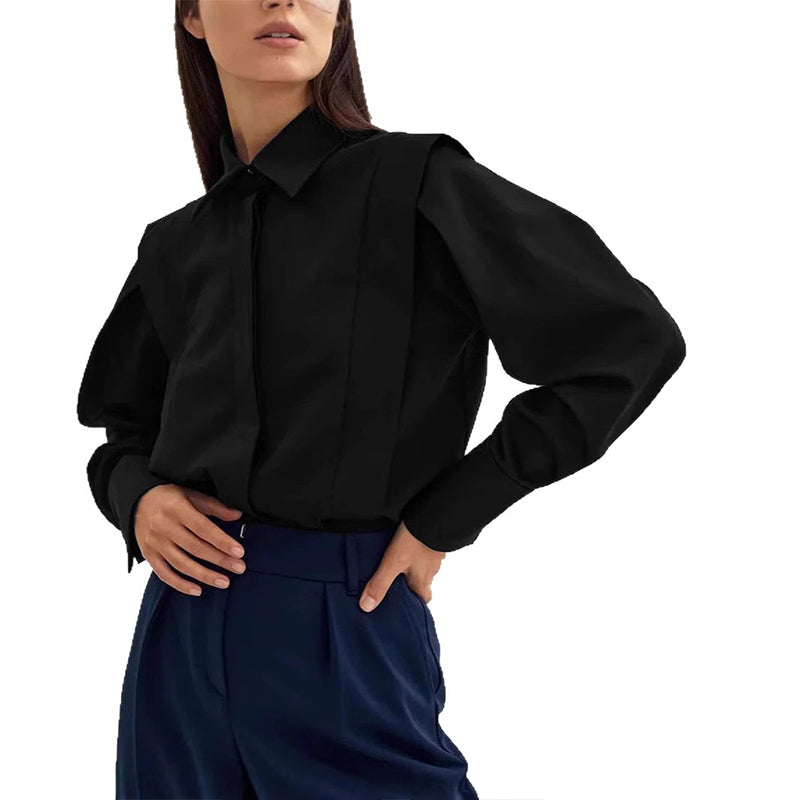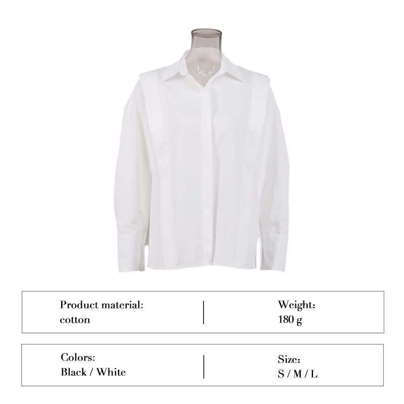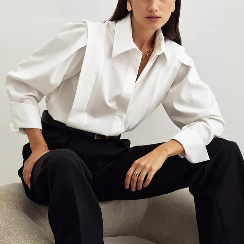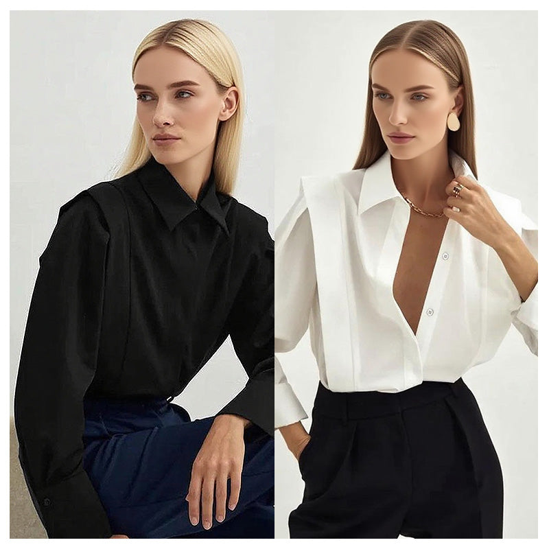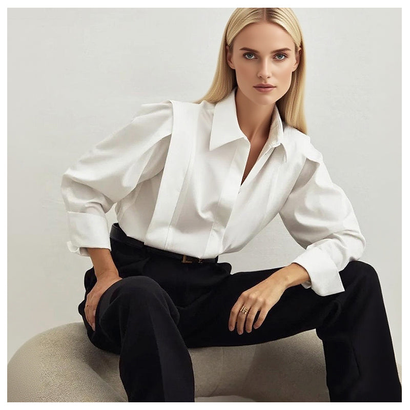 Elevate your workwear wardrobe with this designer-inspired structured shirt featuring French elegance and modern architectural lines. Crafted with precise angular shoulders, this long-sleeve blouse creates a slimming silhouette that transitions effortlessly from office to evening. The unique shoulder construction and premium cotton fabric offer both comfort and sophisticated style for the fashion-forward professional.