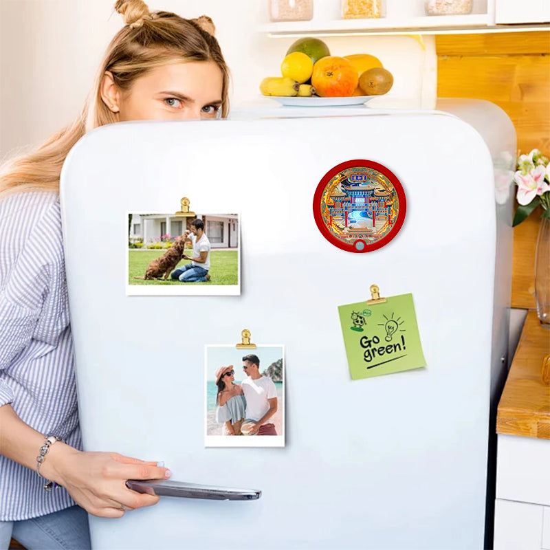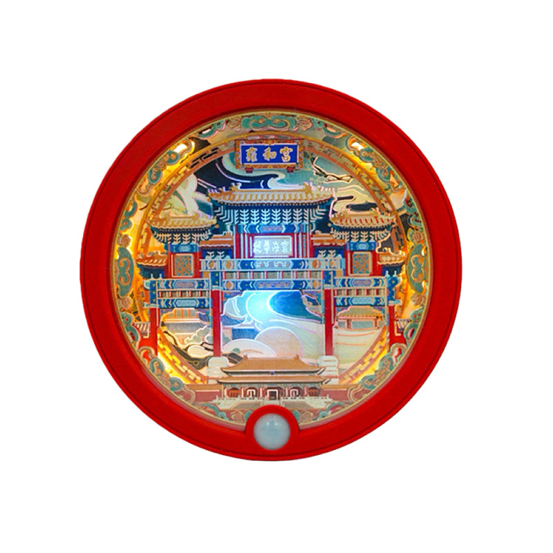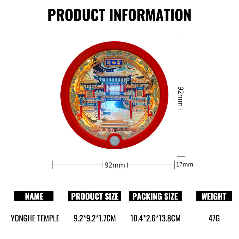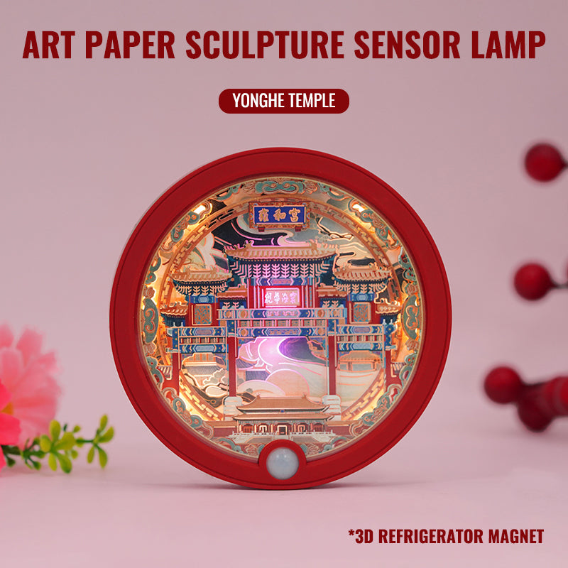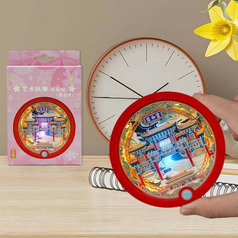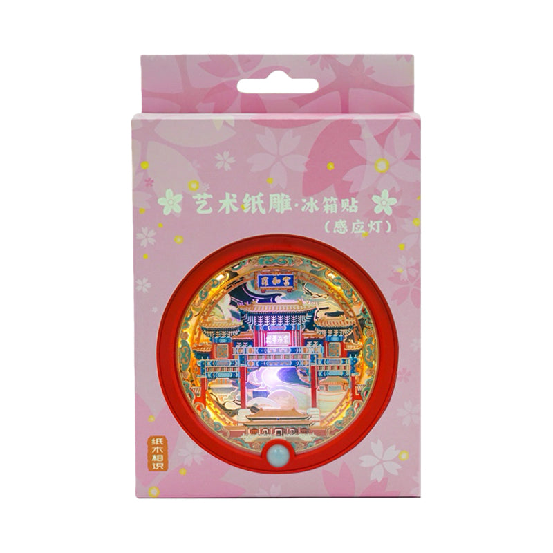 This artistic 3D paper sculpture fridge magnet features Beijing's famous Yonghe Temple. With multi-color LED lighting and detailed craftsmanship, it serves as both a decorative magnetic ornament and an elegant cultural display piece for any metal surface.