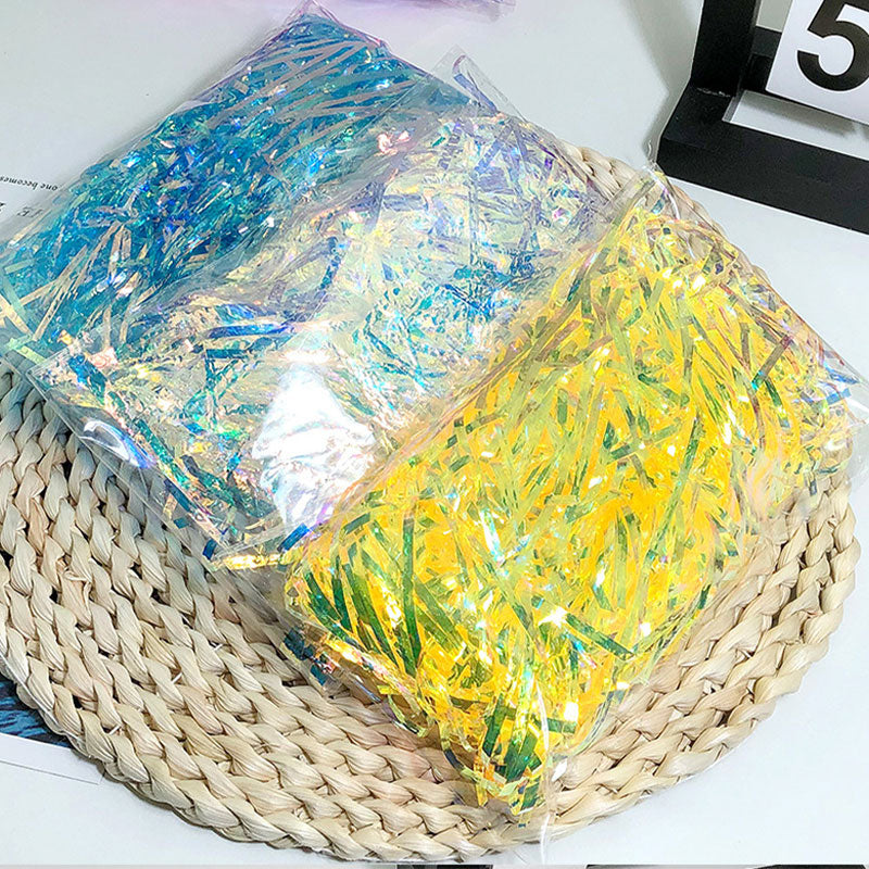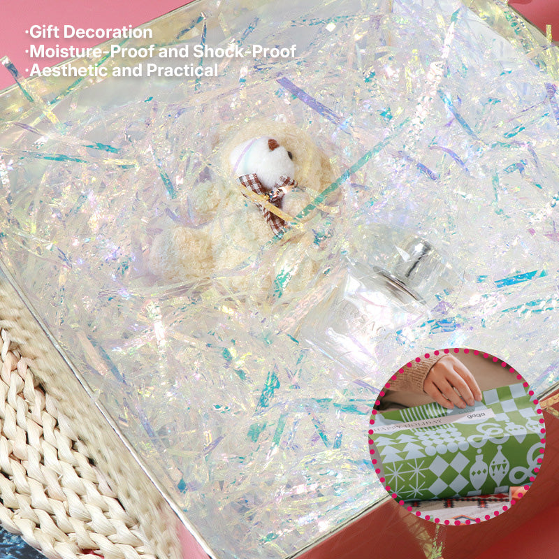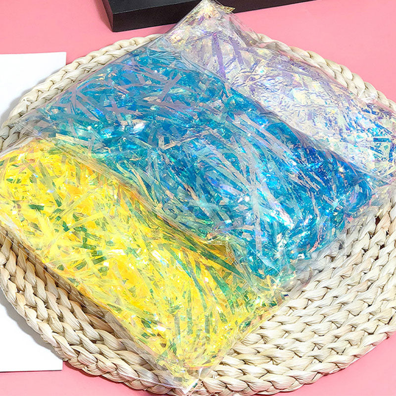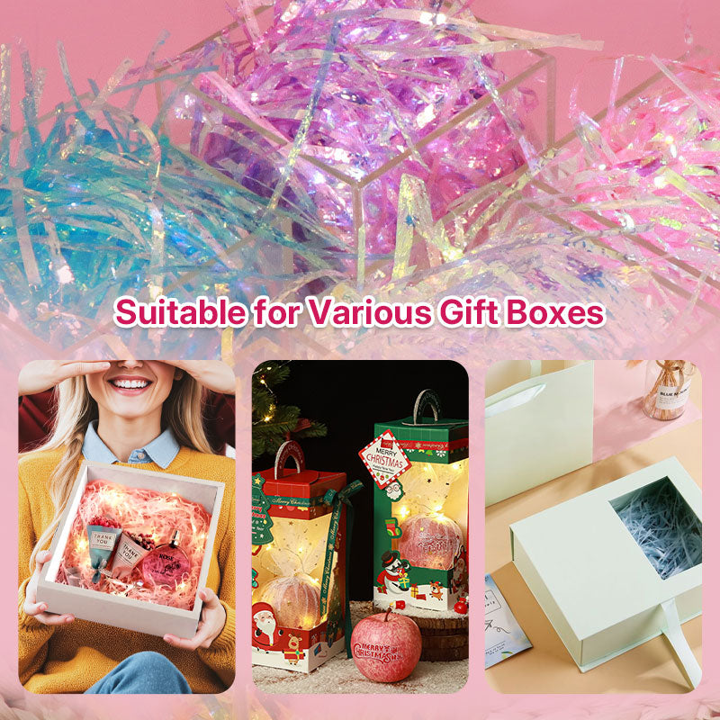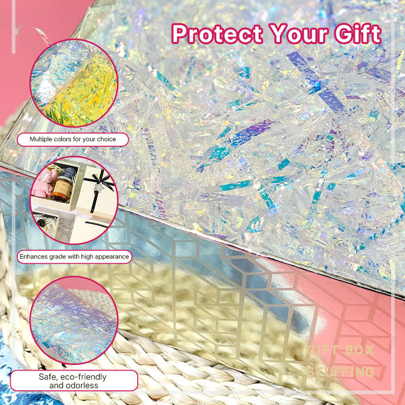 Add magical shimmer to your gift boxes with Aurora Raffia Filling! This eco-friendly, plastic-based decorative filling creates stunning visual effects with its iridescent colors, perfect for elevating gift presentations for any occasion.
