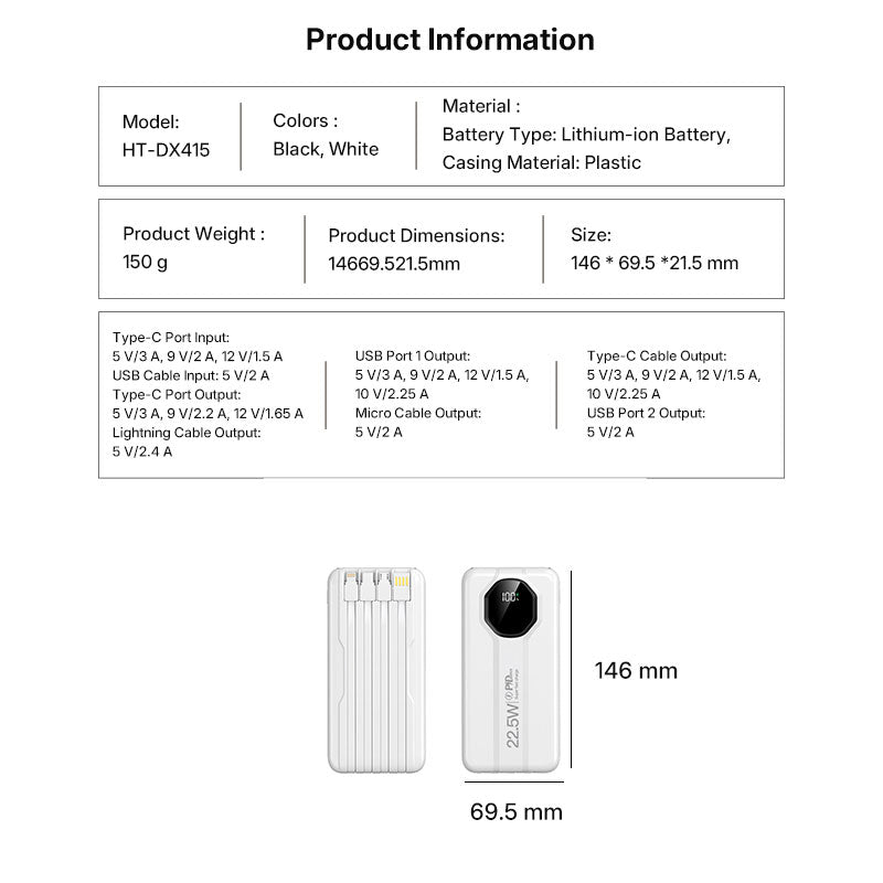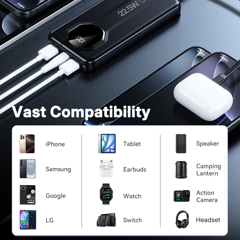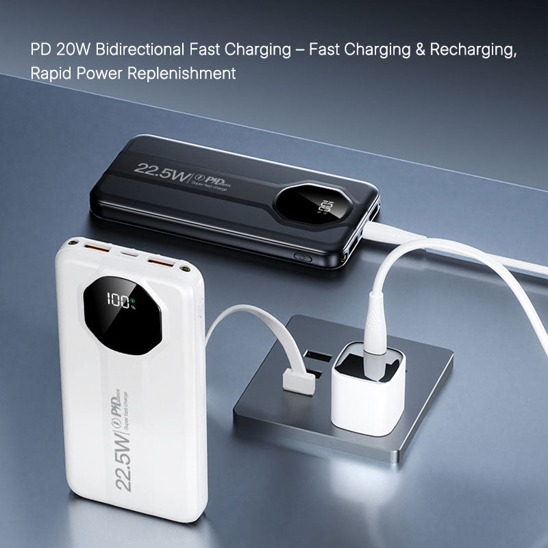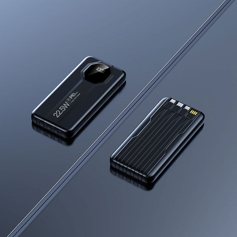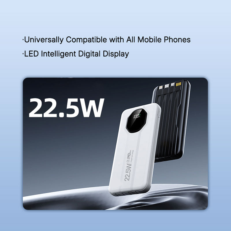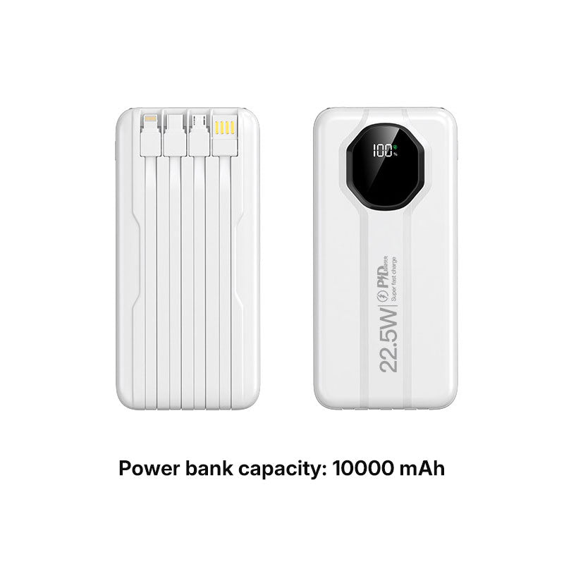 Never run out of power again with our 22.5W Fast Charging Power Bank featuring convenient built-in cables. This 10000mAh portable charger offers super fast charging speeds and universal compatibility with all your devices. The compact design and intelligent digital display make it your perfect charging companion for travel, work, and daily use.