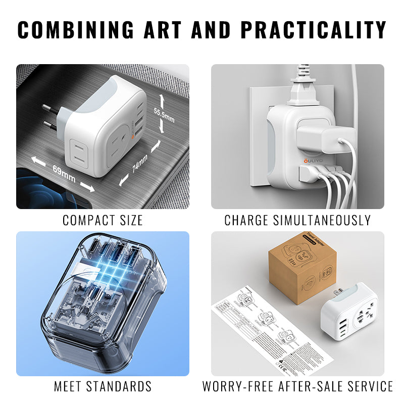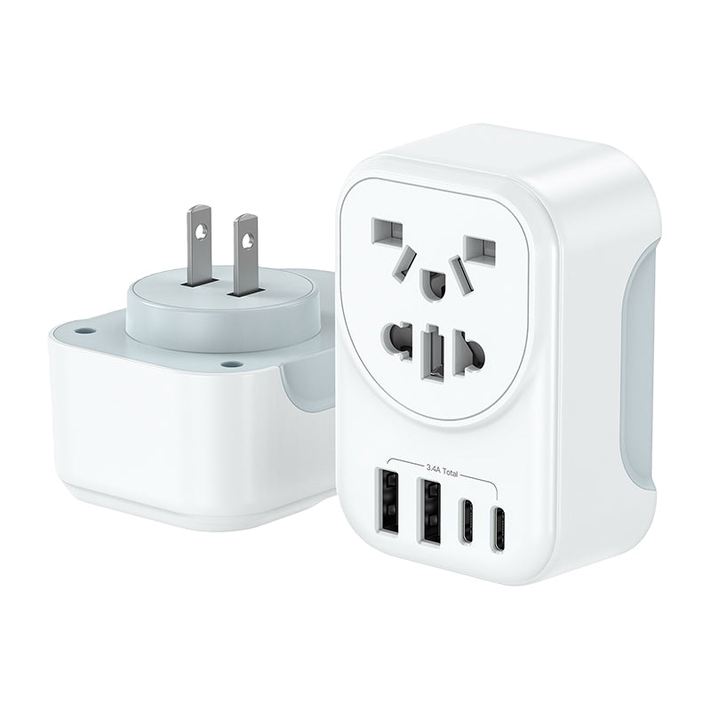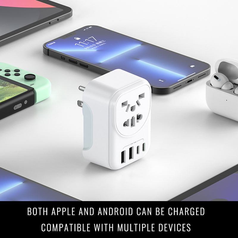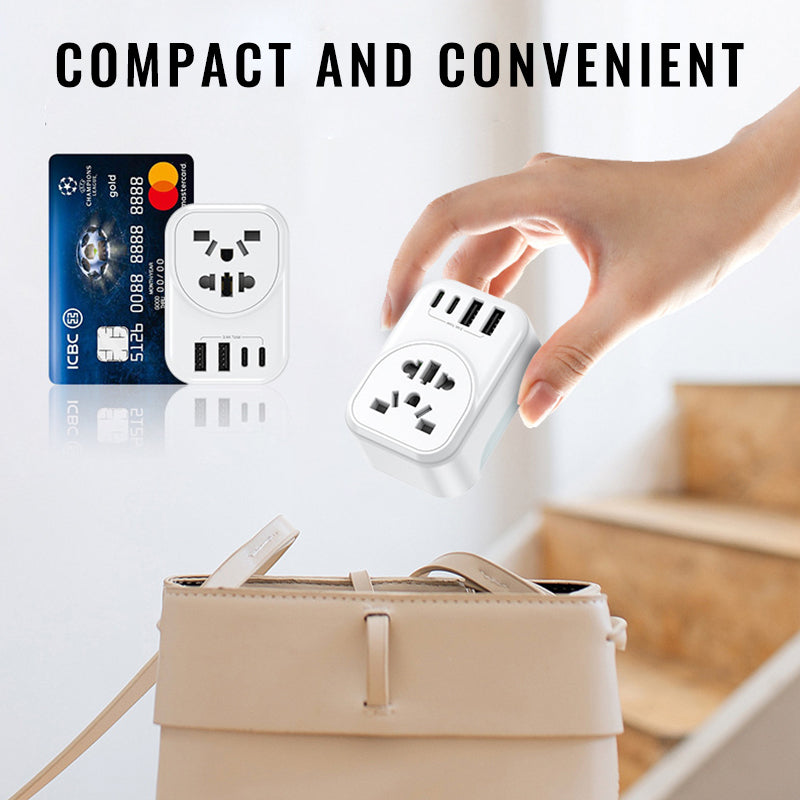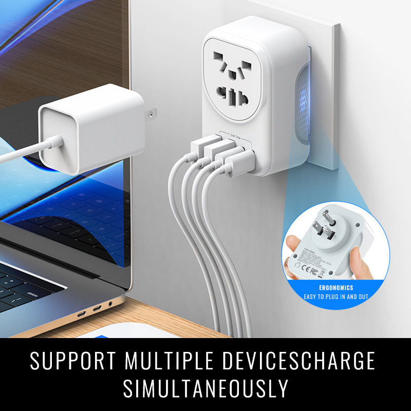 Meet your perfect travel companion – a compact, versatile power adapter that converts EU/US/UK/AU plugs for global use. Featuring 2 USB-A and 2 USB-C ports, this mini adapter lets you charge four devices simultaneously with fast charging support.