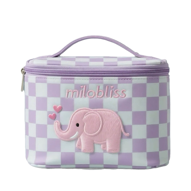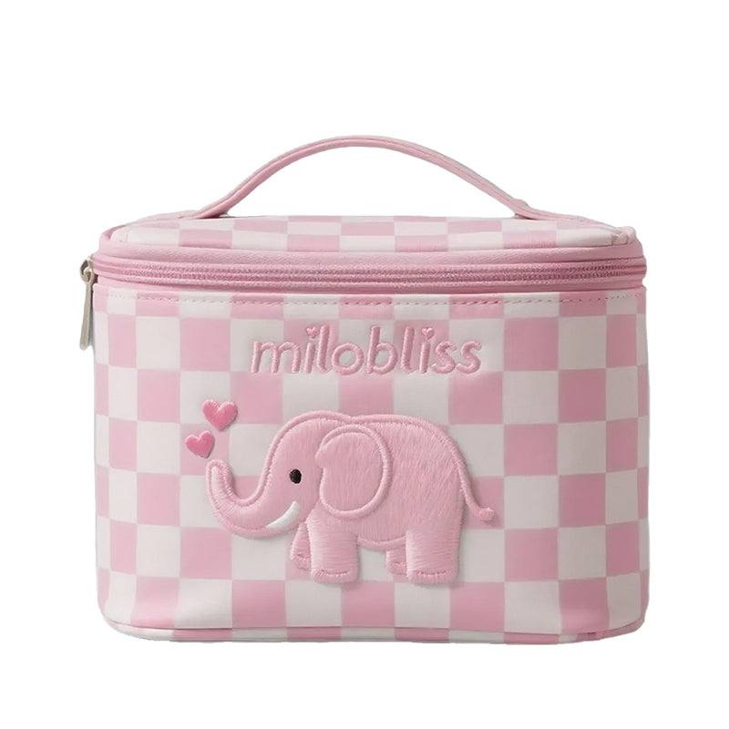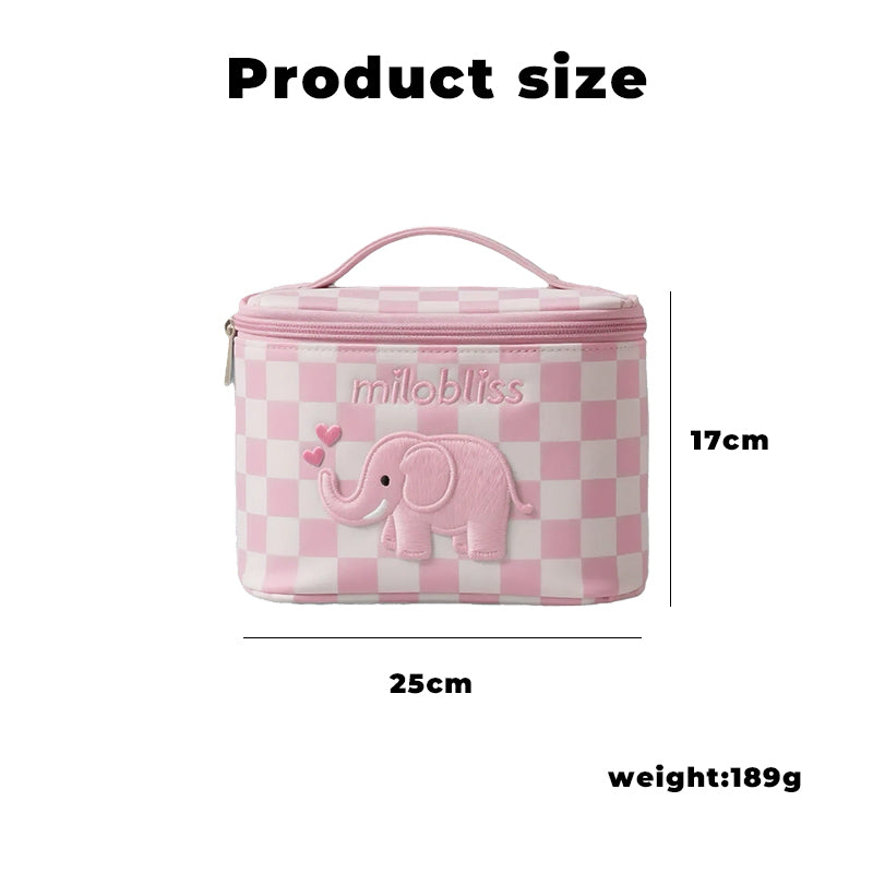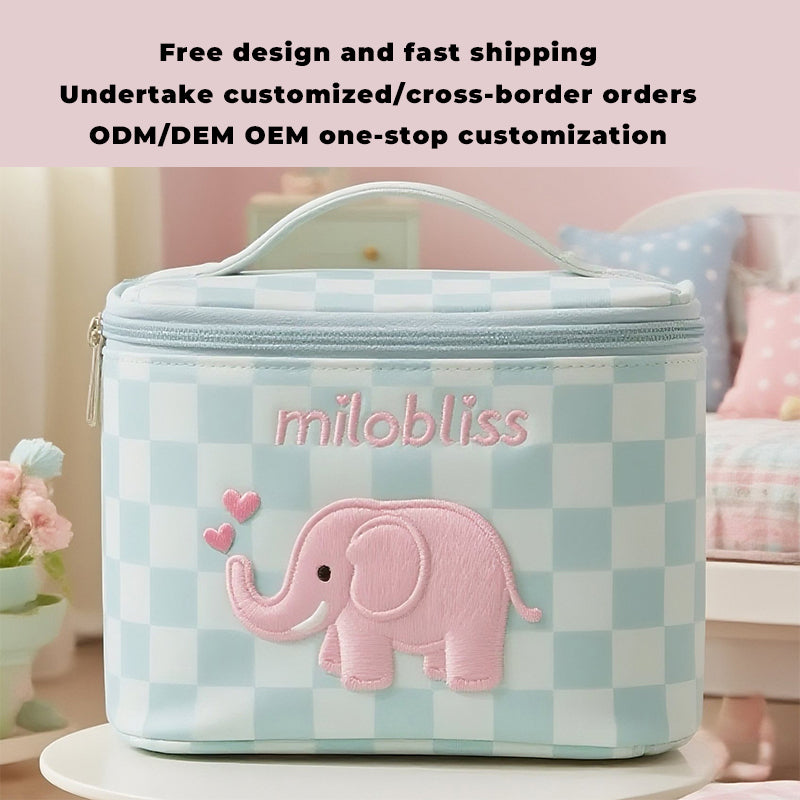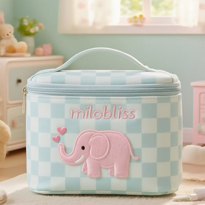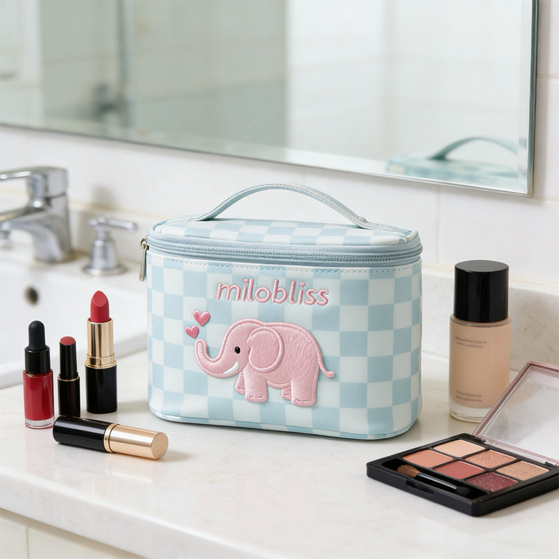 这款定制蓝色毛绒洗漱包,让您的收纳更添魅力。它饰有甜美的粉色小象图案和经典的格子纹,防水防潮,容量充足,还配有便携提手——无论是旅行、日常收纳,还是作为一份贴心的礼物,都是完美之选。