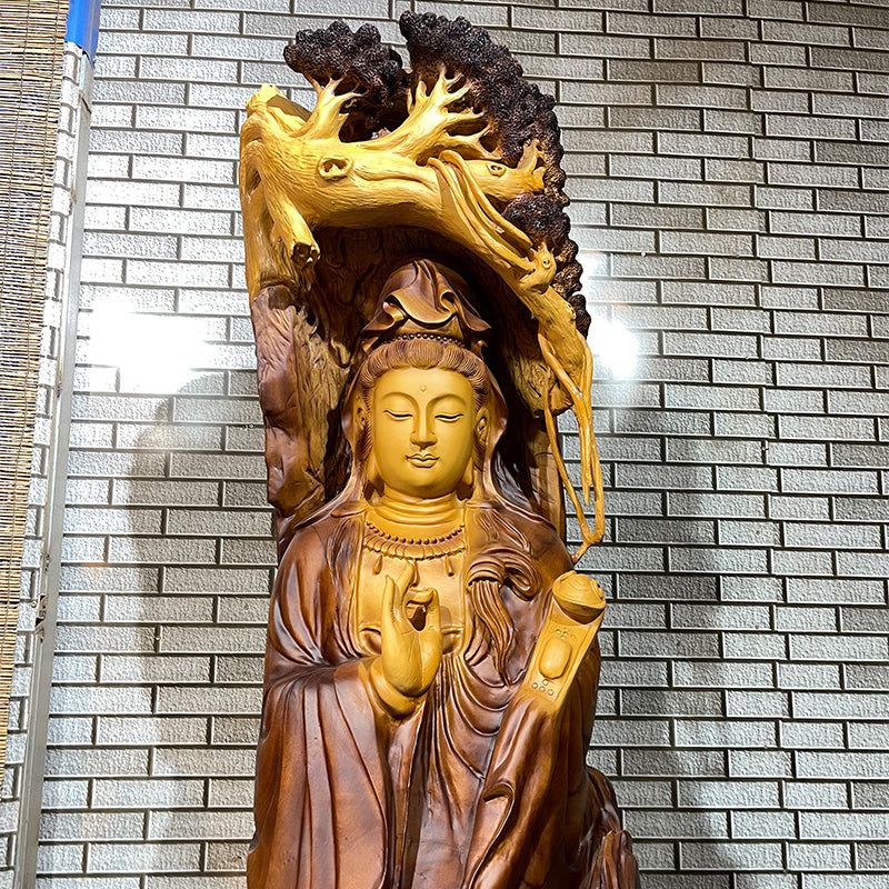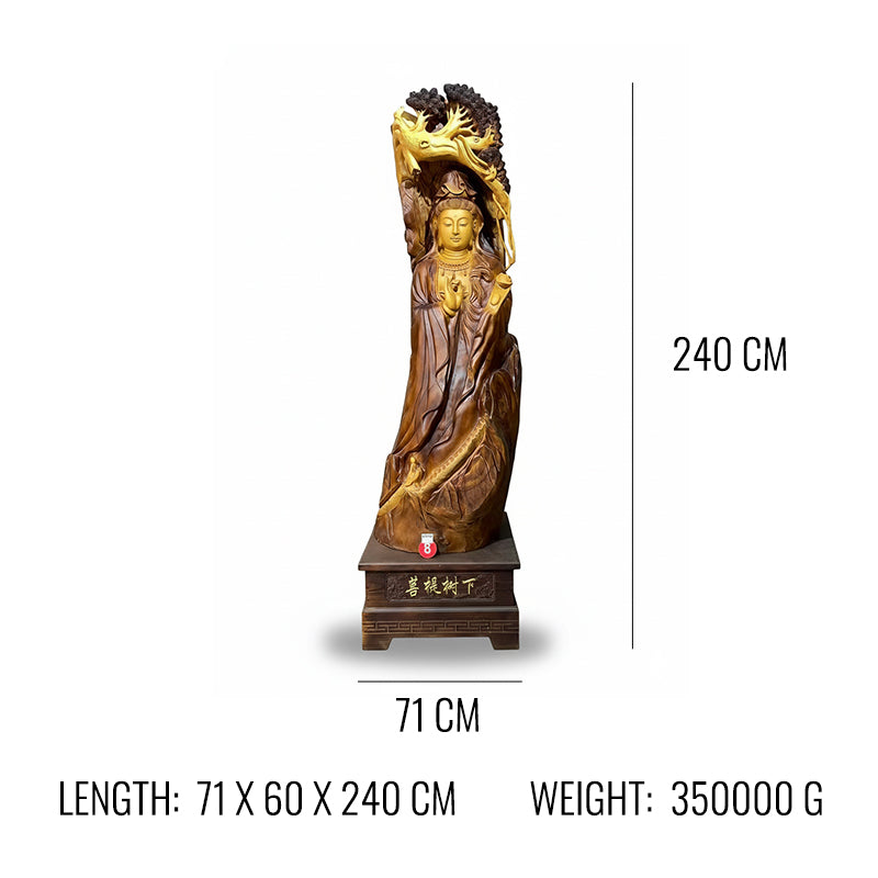 Experience spiritual tranquility with this exquisite "Guanyin Under Bodhi Tree" wood carving. This masterfully crafted sculpture depicts the compassionate Bodhisattva in serene meditation beneath the sacred Bodhi tree, symbolizing enlightenment and divine wisdom. Hand-carved from premium wood, it brings cultural significance and artistic beauty to any space.